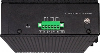 Для подключения к вышестоящему оборудованию предусмотрены 2 комбинированных uplink-порта (100/1000 Мбит/с), каждый из которых может работать либо как медный RJ-45, либо как оптический SFP — с автоматическим отключением дублирующего интерфейса. Уровень управления L2+ обеспечивает поддержку VLAN (IEEE 802.1Q), QoS, IGMP Snooping, порт-безопасности, зеркалирования и других функций, повышающих эффективность и безопасность сети. Встроенный AI WatchDog отслеживает состояние системы и автоматически перезагружает устройство при сбое. Двойное питание постоянным током (12–57 В для коммутации и 40–57 В для PoE), грозозащита 8 кВ, корпус класса IP40 и монтаж на DIN-рейку делают коммутатор устойчивым к вибрации, перепадам напряжения и экстремальным температурам от –40 °C до +80 °C.