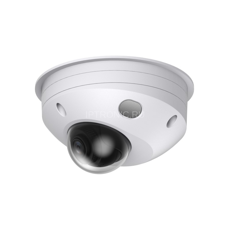Камера оснащена фиксированным объективом с фокусным расстоянием 2.8 мм и широким углом обзора: 96° по горизонтали, 72° по вертикали, 120° по диагонали, что делает её оптимальной для контроля открытых пространств, таких как парковки, дворы, офисные помещения и склады. Для работы в темное время суток предусмотрена гибридная подсветка LED+ИК, состоящая из 2 белых и 2 инфракрасных светодиодов, обеспечивающая дальность подсветки до 25 метров в обоих режимах. Управление подсветкой и режимом «день/ночь» осуществляется автоматически (Smart), вручную или по расписанию.