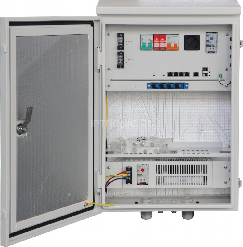 Для поддержания оптимальной работы оборудования шкаф оснащен контроллером температуры с вентилятором, который работает в тандеме с нагревательным элементом, чтобы предотвратить перегрев или обледенение внутри шкафа. Дополнительно, шкаф включает в себя устройства защитного отключения как для переменного, так и постоянного тока, а также грозозащитные устройства для повышения надежности питания и защиты от атмосферных явлений.