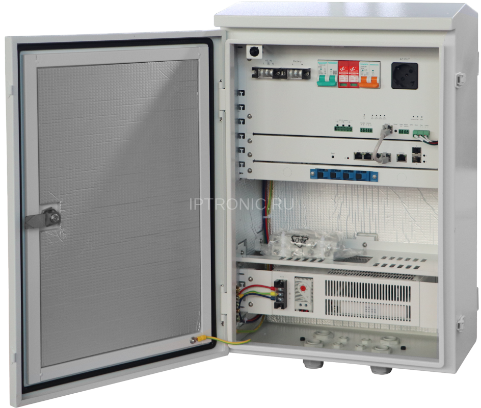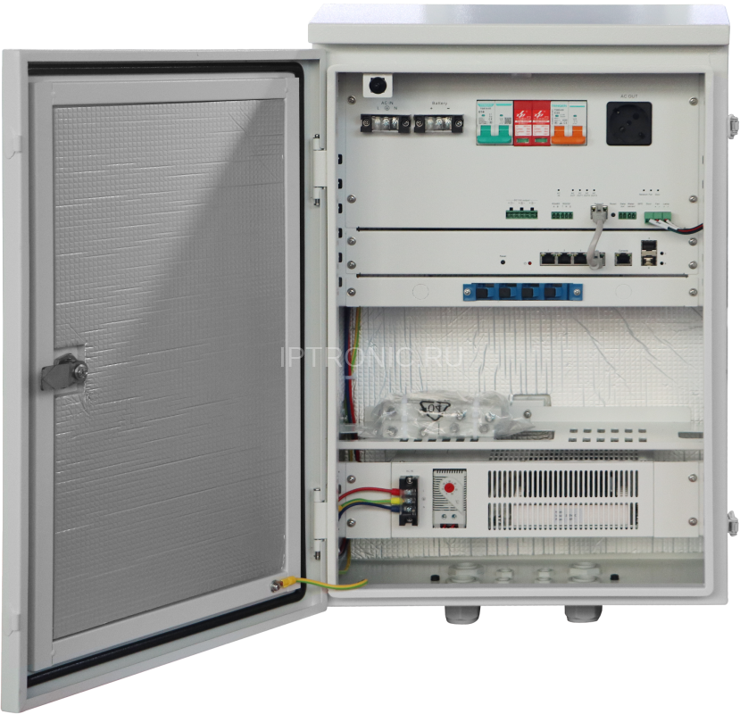 IPTRONIC IPT-PS3-E6P4S2SMCIO_rev.9 - Всепогодный шкаф видеонаблюдения с резервным питанием, встроенным PoE коммутатором и смарт-контроллером. Класс пылевлагозащиты IP66. Металл. Габариты 600*400*230мм. Вес 23кг.