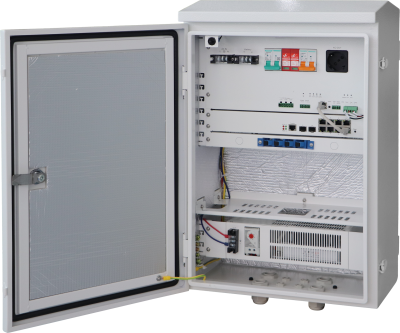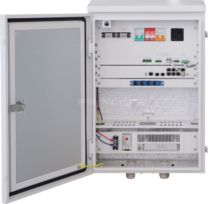 Всепогодный шкаф коммутации с резервированным питанием и отсеком для установки внешних аккумуляторных батарей. Класс пыле- влаго- защиты IP66. В составе встроенный L2 коммутатор на 8 PoE портов; смарт-контроллер с возможностью дистанционного мониторинга и управления параметрами оборудования с помощью ПО; оптический бокс, элементы электрических защит и управления климатом.